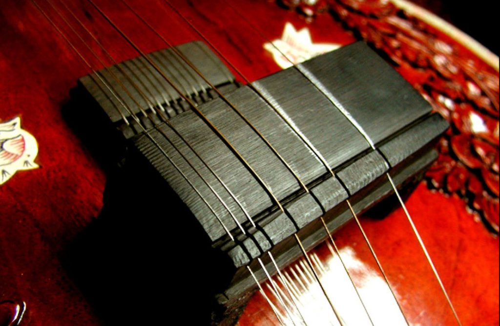Ce n’est que des années plus tard que j’ai pu voir des chevalets sur des instruments indiens. Ils ne ressemblaient en rien à ceux que j’avais imaginés. Ils étaient presque plats. Alors que la corde, sur nos instruments, entre en contact avec une portion relativement étroite du chevalet, dans le cas des instruments à chevalets plats, cette portion est beaucoup plus étendue. Les points de contacts sont multipliés et c’est ce qui produit le dégagement d’harmoniques, mieux que ne le faisait mon chevalet à chevilles biseautées en ébène.