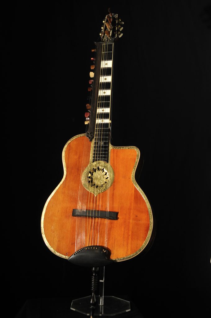 Et pour compléter la métamorphose de ma guitare – que j’avais entre temps baptisé guitare-veena – j’ai ajouté douze cordes sympathiques de résonance. Ces cordes, qui ne sont pas utilisées par le musicien, ont la particularité d’entrer en résonance lorsque des notes de même hauteur sont jouées sur les cordes mélodiques, donnant ainsi une ampleur et une profondeur remarquables au son. Elles sont munies, elles aussi d’un chevalet plat qui permet le dégagement des harmoniques. Elles sont attachées le long du manche par 12 chevilles en bois.